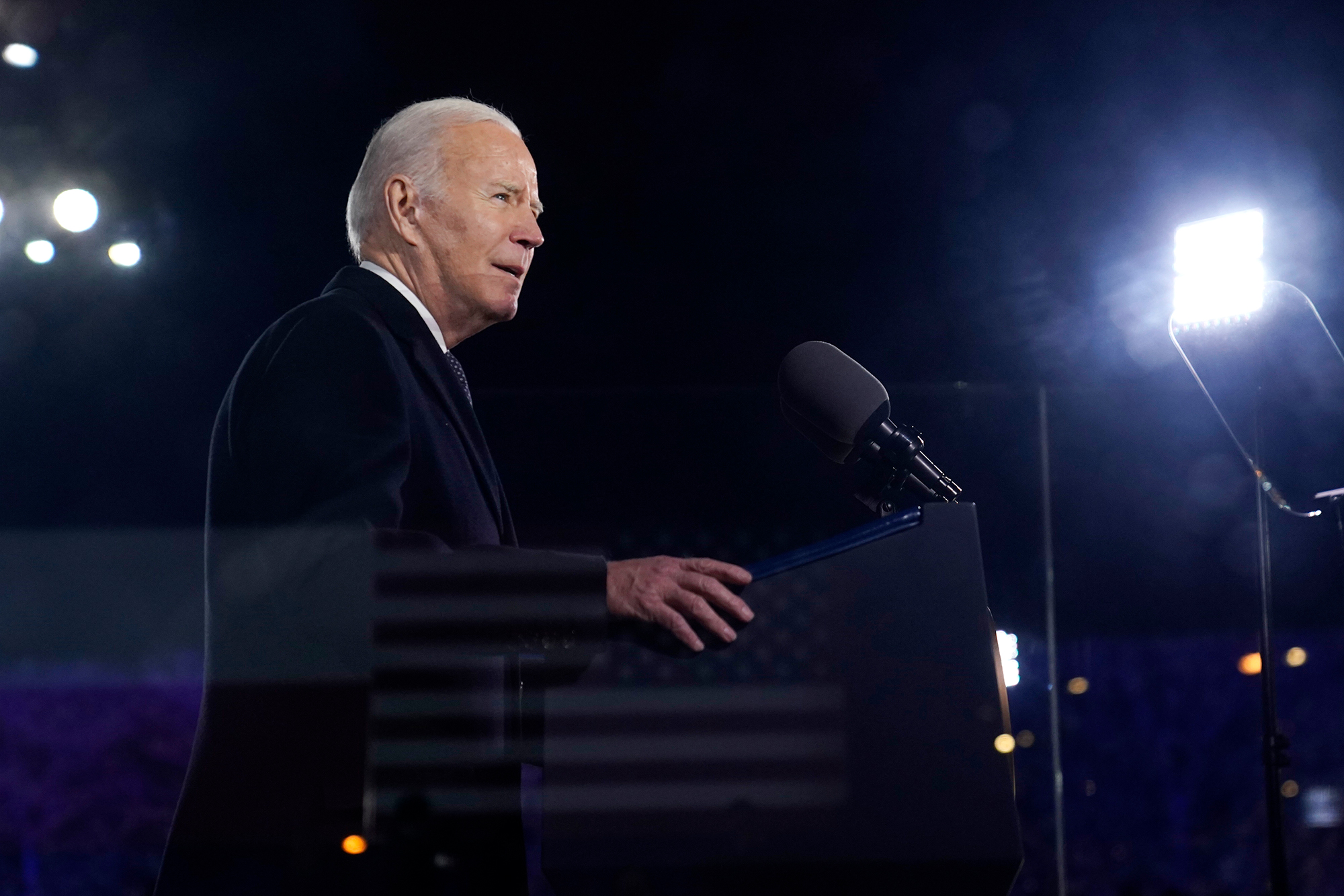 President Joe Biden delivers a speech marking the one-year anniversary of the Russian invasion of Ukraine, Tuesday, Feb. 21, 2023, at the Royal Castle Gardens in Warsaw. (AP Photo/ Evan Vucci)