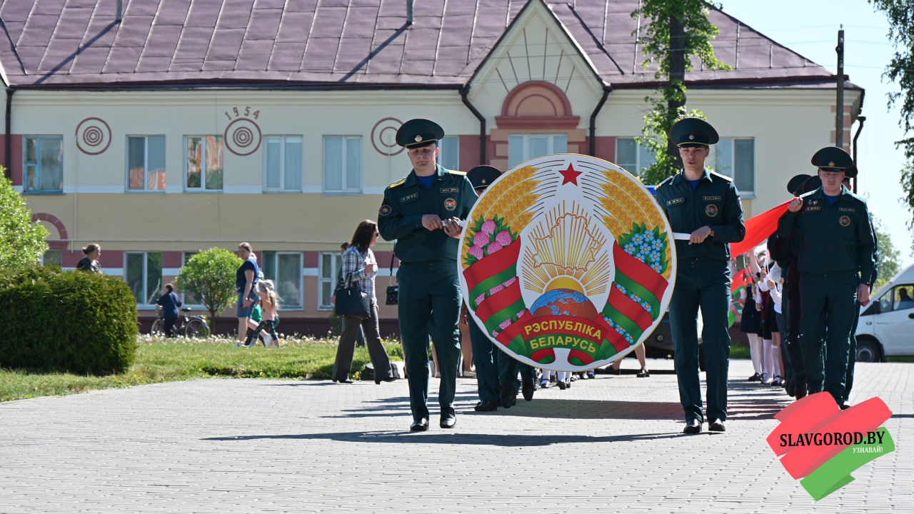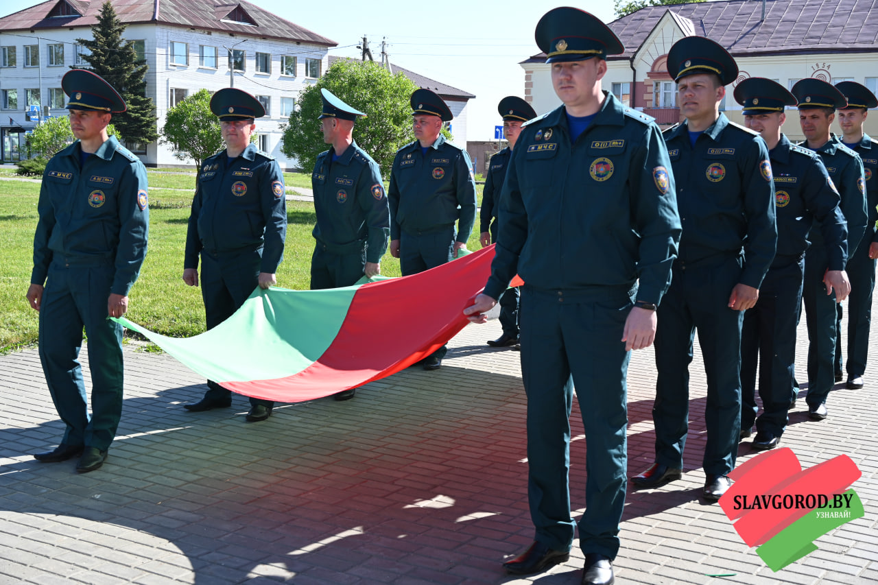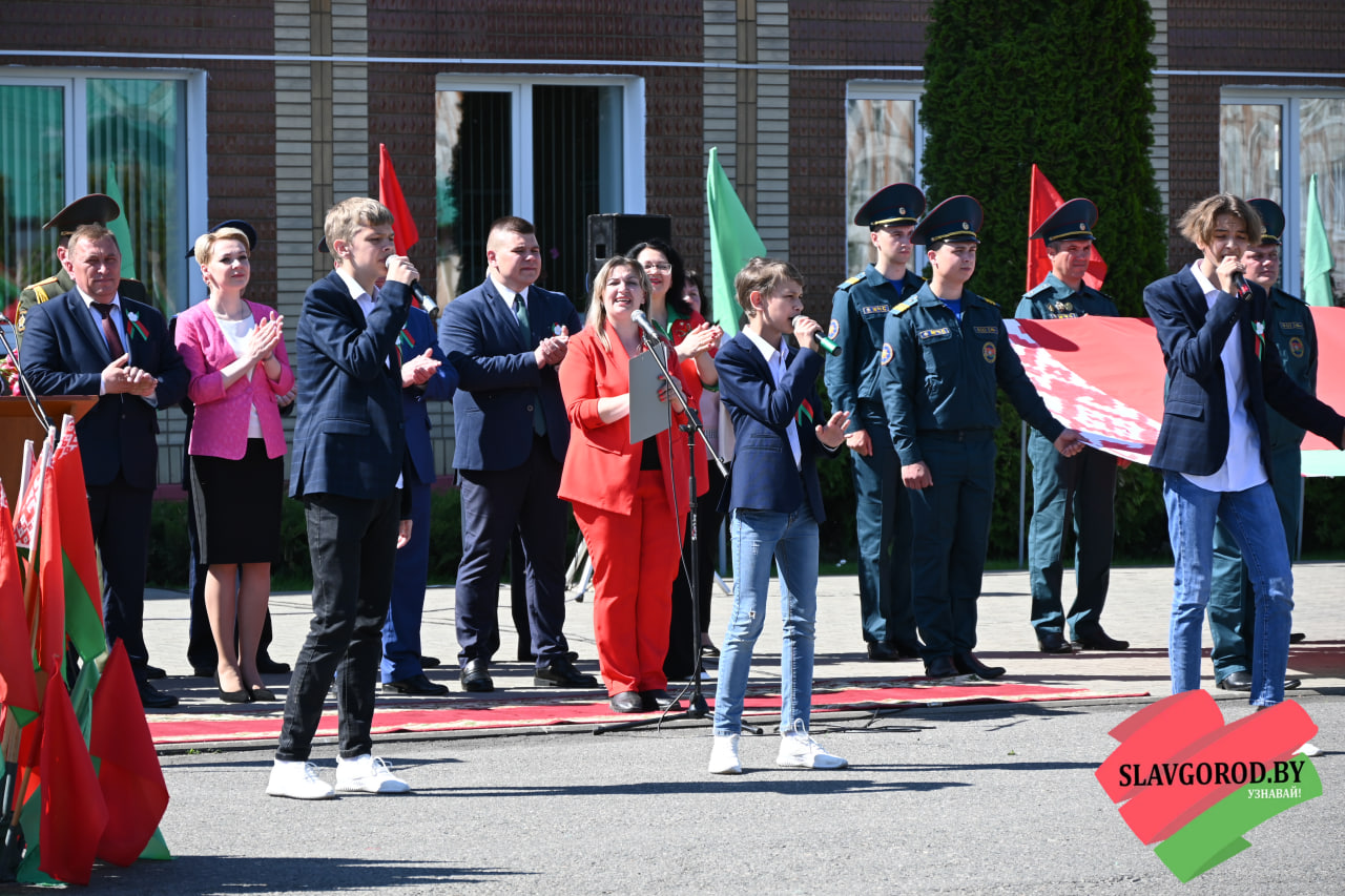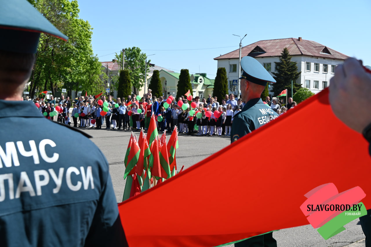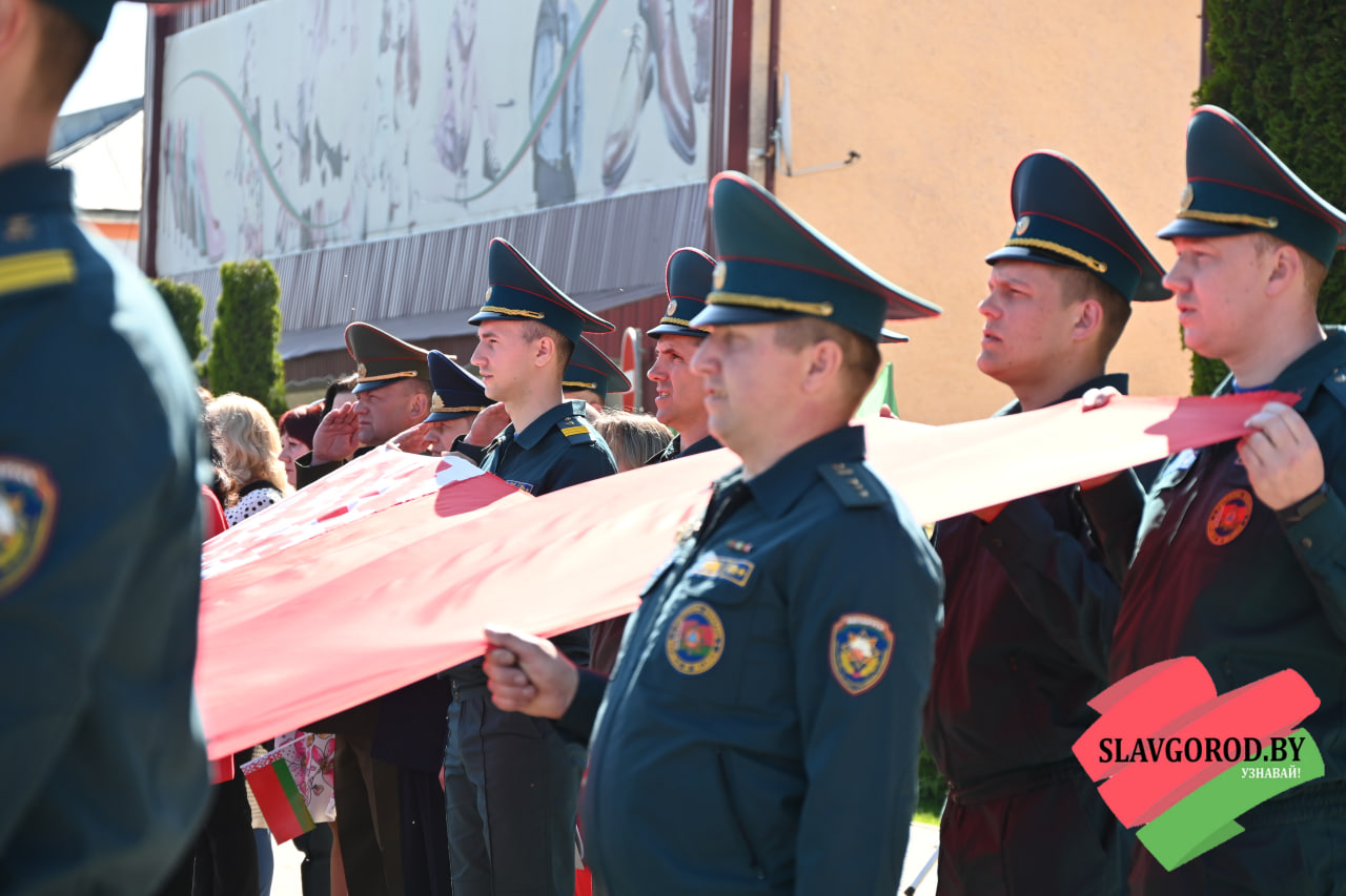Сотрудники Славгородского РОЧС внесли на площадь Государственные символы — Герб и Флаг, а юные славгородчане, которых чуть позже принимали в октябрята и пионеры, исполнили Государственный Гимн.