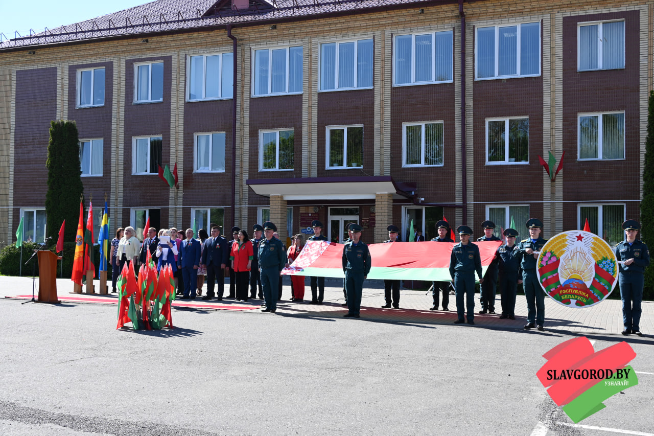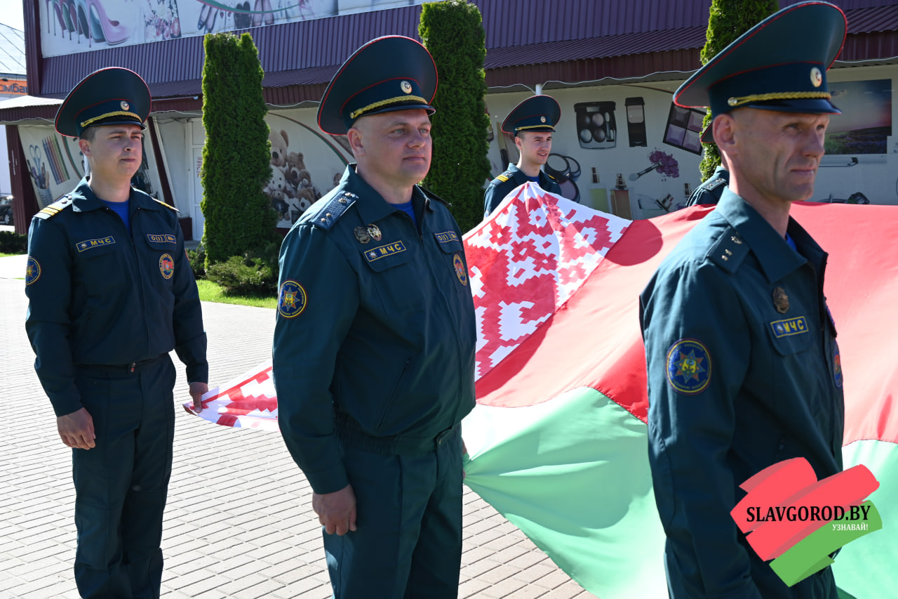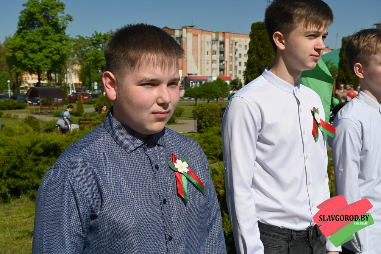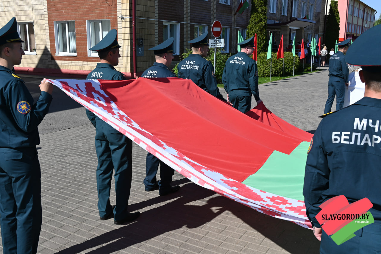 Сотрудники Славгородского РОЧС внесли на площадь Государственные символы — Герб и Флаг, а юные славгородчане, которых чуть позже принимали в октябрята и пионеры, исполнили Государственный Гимн.