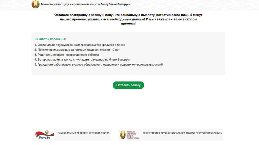 В сети распространяются фишинговые сайты Министерства труда и социальной защиты с обещанием социальных выплат, сообщили БЕЛТА в пресс-службе ведомства.