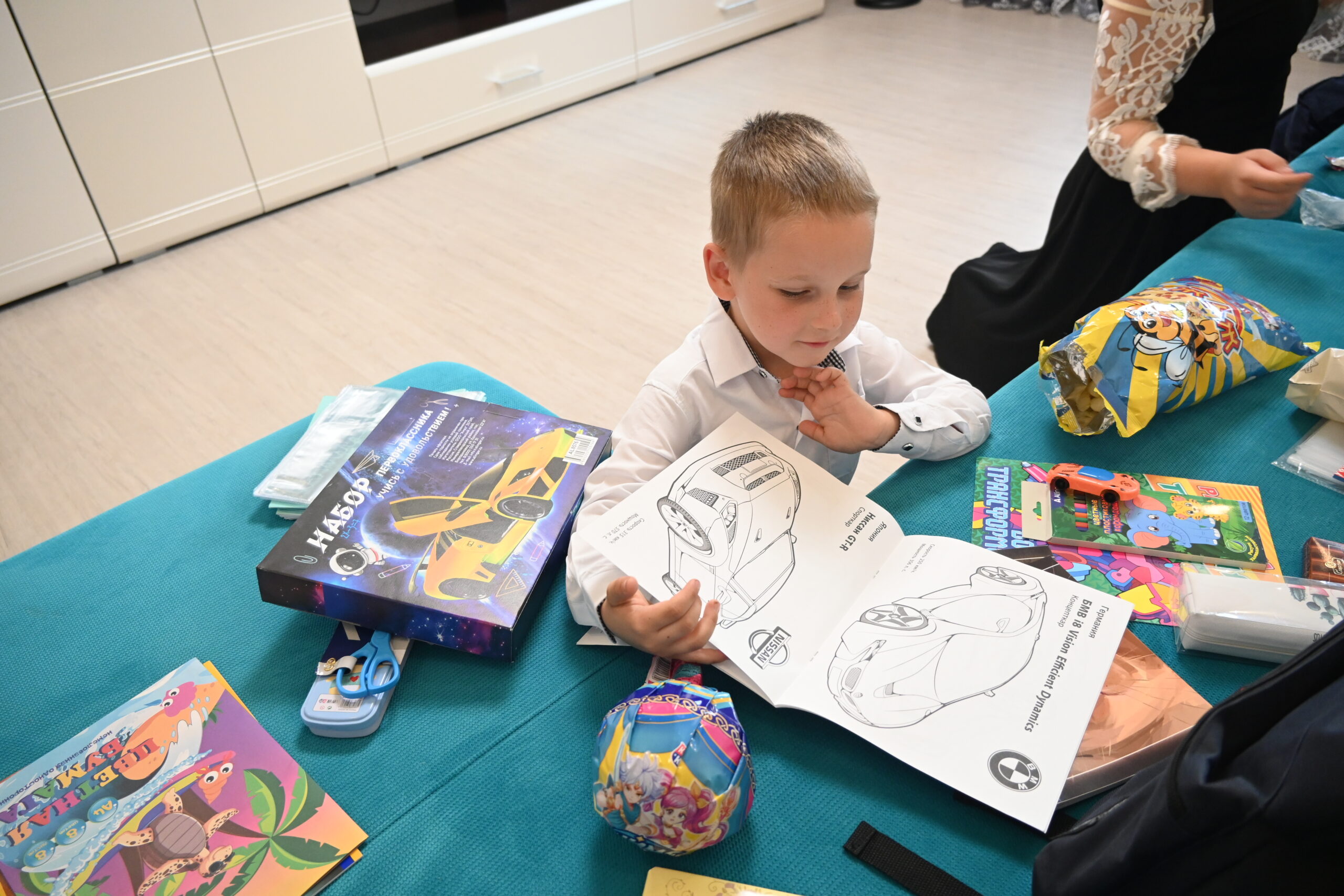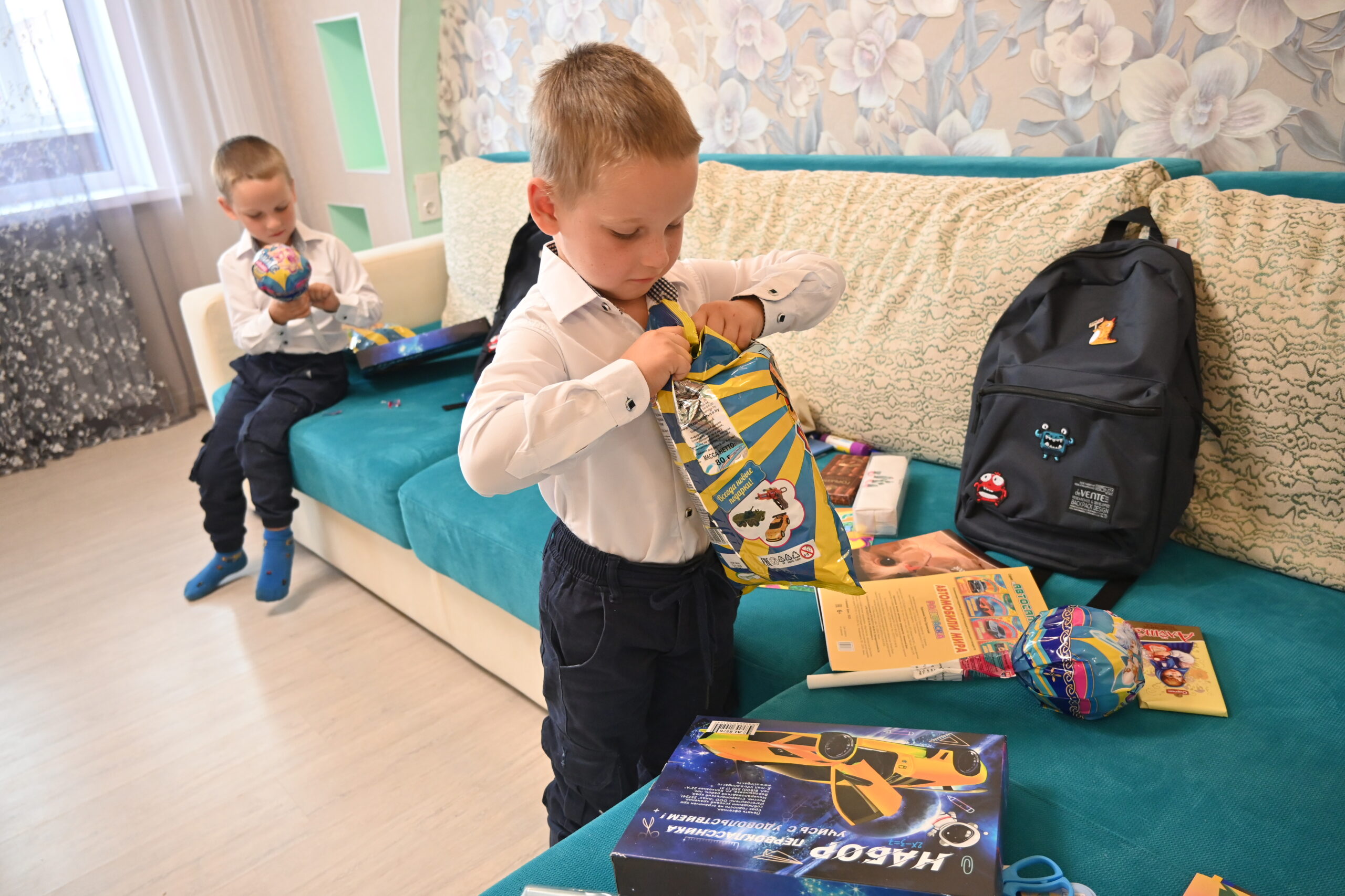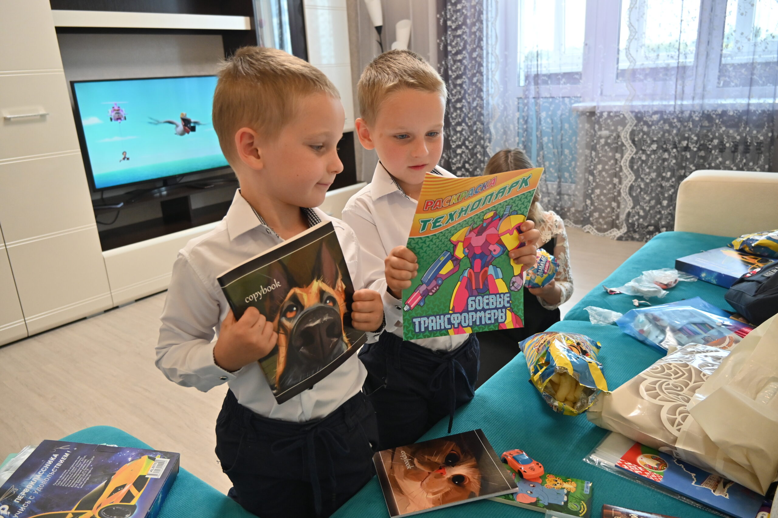 Для двойняшек Арсения и Артёма, которые в этом году впервые переступят порог школы, и их старшей сестры Ангелины, семиклассницы, гости приготовили особые сюрпризы: новые рюкзаки, полный набор школьных принадлежностей и сладости.