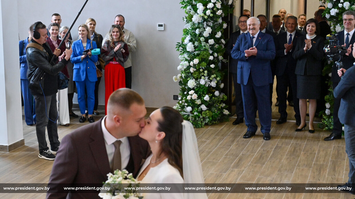 Александр Лукашенко посетил зал торжественных мероприятий. Здесь как раз проходила церемония бракосочетания.