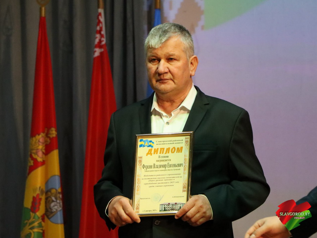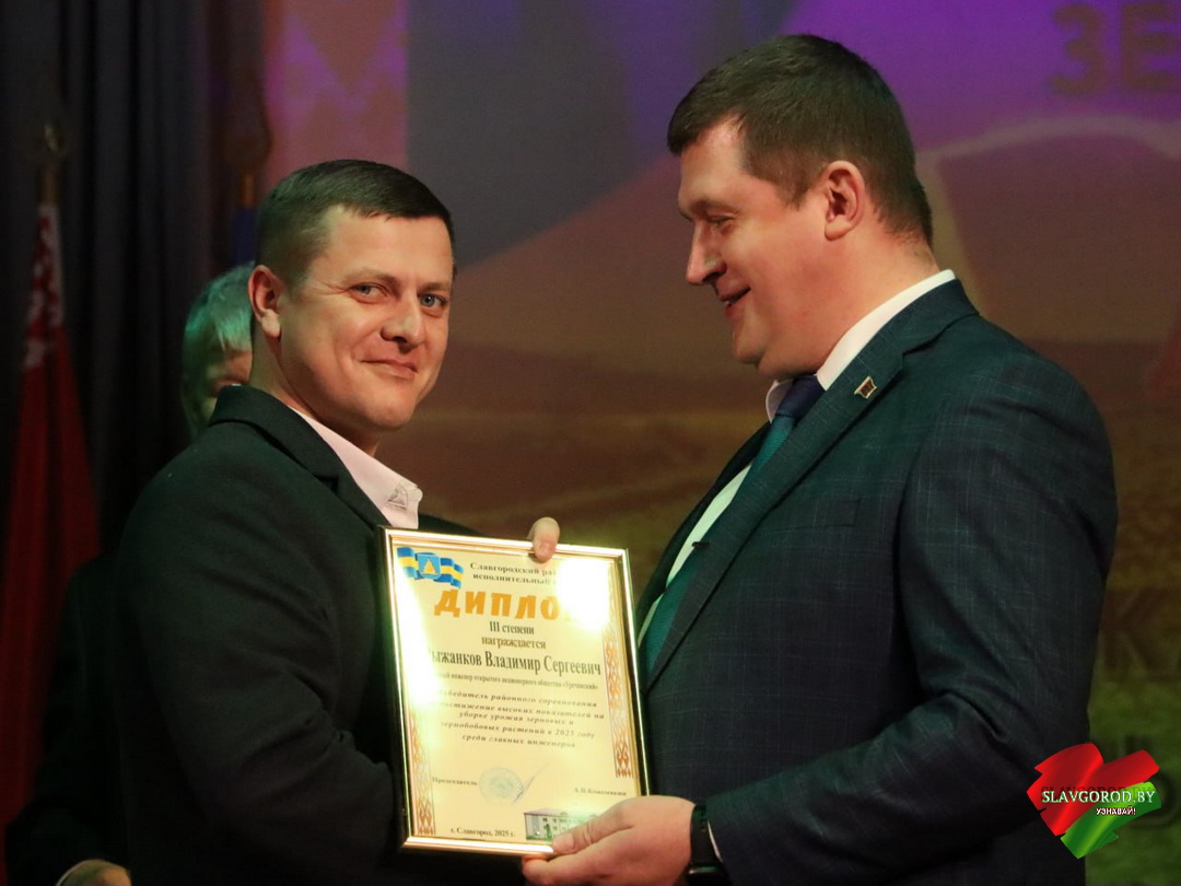 – Труженики Славгородчины проявили высокую ответственность на хлебной ниве. Собран достойный урожай зерновых и зернобобовых культур, рапса, кукурузы. Намолотили без малого 36 тыс. тонн зерна. В районе получена урожайность зерновых и зернобобовых культур на уровне 27,9 ц/га. Говоря об урожае 2025 года, хочу отметить, что были созданы надлежащие условия для людей, обеспеченна слаженная работа в сельском хозяйстве, приняты меры по усилению материальной базы организаций. Сегодняшний праздник – это признание того, что именно вы, люди, которые верны земле, обеспечиваете стабильность и уверенность в завтрашнем дне.