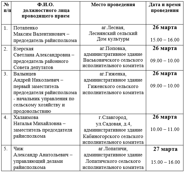 24 мартас 11:00 до 12:00состоится выездной приём граждан, представителей юридических лицдиректора учреждения «Славгородский районный центр социального обслуживания населения» ВОРОНЦОВОЙ Людмилы...